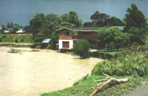 Above left: a fairly typical rural landscape in Horowhenua with radiata pine forest in the background, photo: Paul Knight. Right: a home teetering on the edge of the engorged Kiwitea stream during the Manawatu floods of 2004, source: Manawatu District Council.