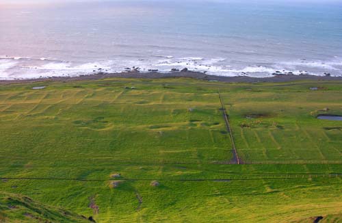 Photo top: Palliser Bay from the sky. Photo bottom: These stone rows at Okoropunga, on the south Wairarapa coast (east of Palliser Bay, but comparable in nature), are from a 15th-century Māori settlement. The rows generally run parallel to each other. Some rows are thought to mark boundaries, but it was the rows themselves on which crops were planted – the soil covering the rows tends to be warmer and better for growing plants like gourds (Photo: Bruce McFadgen).