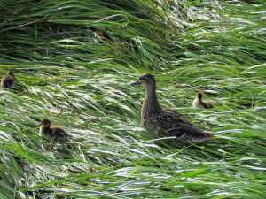 Photo top: a view of the Waitangi Park wetland. Above right: a duck using the prolific reeds in the wetland as a sanctuary for her ducklings. Above centre: another view of the wetland, with the Sunday market vehicles and stalls in the background (All photos by C. Knight).