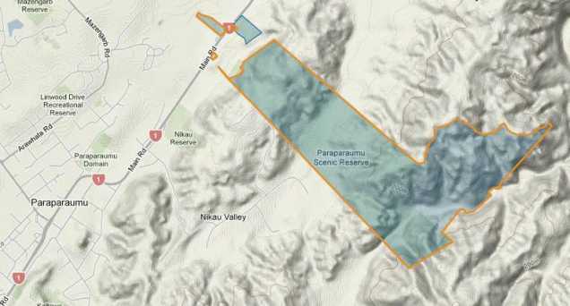 This striking landscape is comprised of bush regenerating on ungrazed pasture on the left-hand side of the fence-line, and pasture with remnant bush on the right-hand side. The left side is part of the Paraparaumu Scenic Reserve, a 256 hectare reserve, located to the east of Paraparaumu [see map below]. The right-side is part of lifestyle blocks off the Nikau Valley rural subdivision.