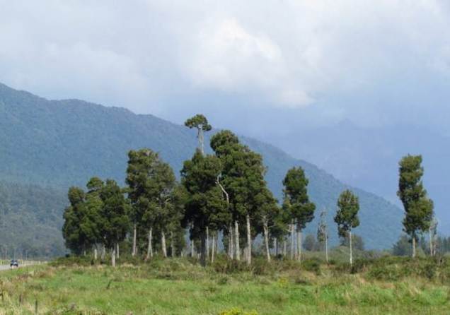 Photo above: Stand of trees on Kokatahi farmland, Kaniere-Kowhitirangi Road [click here to view approximate location]. The car at the far left provides some sense of scale and grandeur of these trees. Much of the West Coast plains was once covered in wetland forests, the canopies dominated by the towering kahikatea (New Zealand’s tallest tree, at up to 60 metres). Farming in the area started in the late 1860s, when the mining industry was burgeoning. Important crops were oats and vegetables, which were required to feed the gold rush miners and their horses. (All photos: C. Knight.)