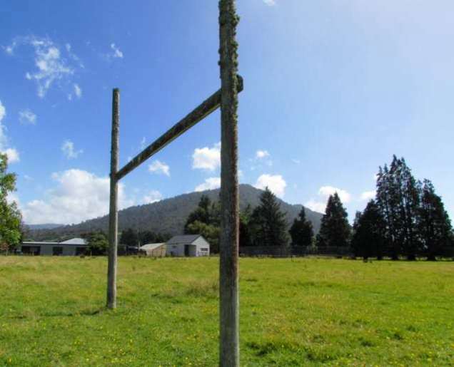 Photos above and below: “Landmarks” of the Koiterangi (Kowhitirangi) township – the settlers’ hall and the lichen-covered goal posts of the adjacent rugby paddock. Of this settlement, the “Cyclopedia of New Zealand” stated in 1906: “Its population at the census of 1901 was eighty-five. The district began to be occupied as a farming settlement about the year 1880, and a a large extent of the country has recently (1905) been thrown open for selection, including ordinary Crown lands, private lands, a municipal reserve of 2,000 acres, and other areas resumed under the Land for Settlement Act. The district has a creamery owned by the Kokatahi Dairy Factory Company, a small lime-burning plant, and a sawmill. There is also a local public school, which is attended by about thirty pupils. There is a considerable amount of good timber in the district, and there are good gravelled roads. In the year 1903 a fine bridge was erected over the Koiterangi river to connect the settlement with Kokatahi and Hokitika.”