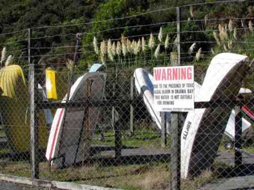 Photo top: the lake seen from the settlement near Okawa Bay. Above left: a sign at Okawa Bay warning lake-users about the toxic algal bloom in the lake. (Photos: C. Knight)