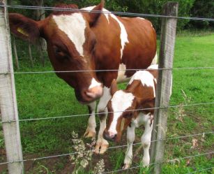 The second picture is of a cow and her calf, who were standing at the front fence of their paddock when I was taking photos of the kahikatea and the goat across the road, evidently wondering why I found their ungulate neighbour so fascinating (see below). They were very friendly, and both enjoyed a stroke on the nose.