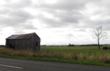 Photo top: a derelict shed in a field near Kiwitea. Middle: Fields on the river terraces overlooking the Oroua River, seen from the Cheltenham Kimbolton Road, near Kiwitea. Above left: the Bank of New Zealand building in the main street of Kimbolton, now apparently part of a house. (Photos: C. Knight)