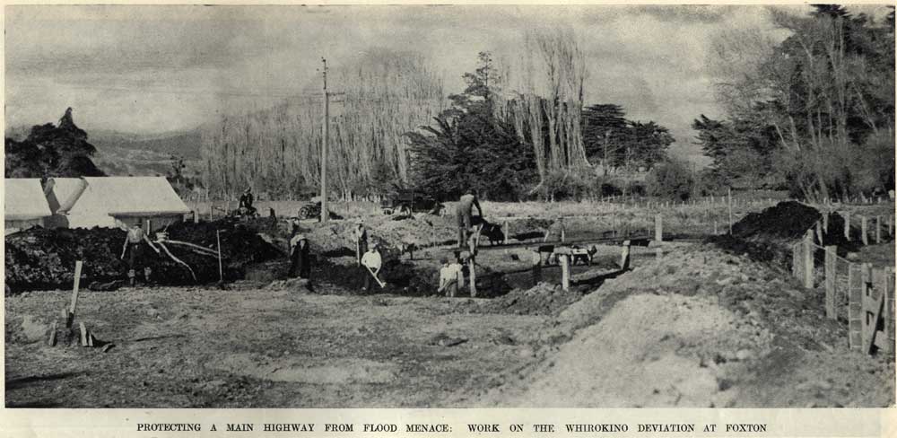 Photo top: Foxton on the Manawatu River, 1879, watercolour by Robert George Palmer. Shows a paddle-steamer, three larger ships and a canoe on the Manawatu River, houses and A. J. Whyte’s hotel (the large building on the left) viewed from the opposite bank of the river. Not to be reproduced without permission by Alexander Turnbull Library, Wellington, ref. ID: C-030-014 Middle: A satellite view of the area today, the cut off original course of the river can be faintly seen looping up to the town of Foxton. Above: Entitled “Protecting a main highway from flood menace: work on the Whirokino Deviation at Foxton”, this photograph appeared in the Auckland Weekly News in 1936. Sir George Grey Special Collections, Auckland Libraries, AWNS-19360617-45-1.
