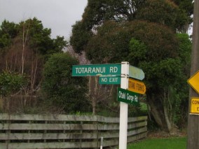 Photo top left: A grove of totara on Old Hautere Road. Top centre: A grove of totara on Totaranui Road. Above centre: “Totara Reserve” tree tunnel on Otaki Gorge Road. Above right: Totaranui Road sign. (All photos C. Knight).