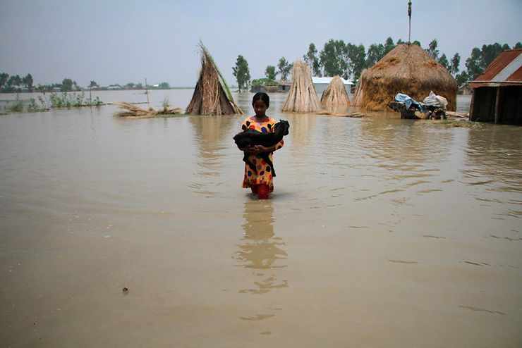 A girl carries a goat through floodwaters in Bangladesh. Climate Outreach.