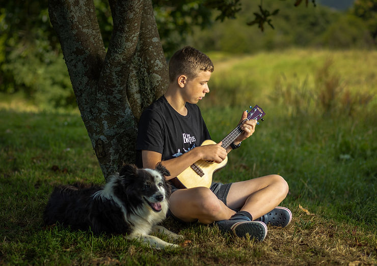 Carter playing his beloved uke, Pippa by his side, under the macadamia nut tree.