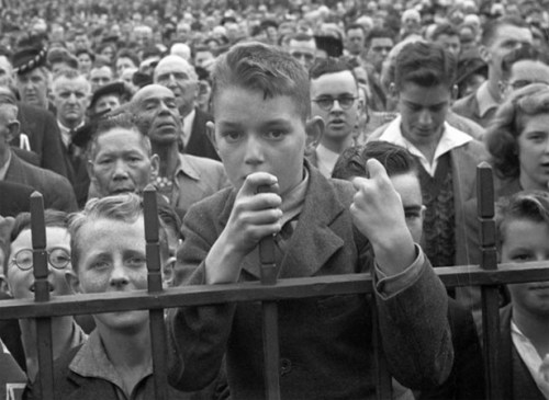 Crowds at the VE Day celebrations, Parliament Buildings, Wellington, 1945. Alexander Turnbull Library.