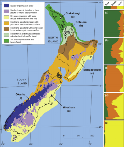 As well as being a lot colder, the landscape was quite different then – instead of the dense forest that greeted our island’s first settlers 700 or so years ago, the landscape was a mosaic of grassland and shrubby plants, with patches of beech and a few scattered conifers. See vegetation map from Newnham, Wilmhurst and McGlone (2013).