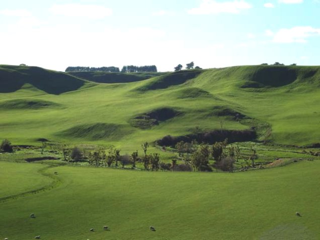 This photo of a pastoral farm is taken from the roadside of State Highway 3, about 10km south-east of Wanganui City [click here for location]. Hollows in the irregularly formed hillsides attract shadows which gives the landscape an alluring sculptural form, and hints at an intriguing geological history … perhaps the effects of volcanic activity? Continue reading